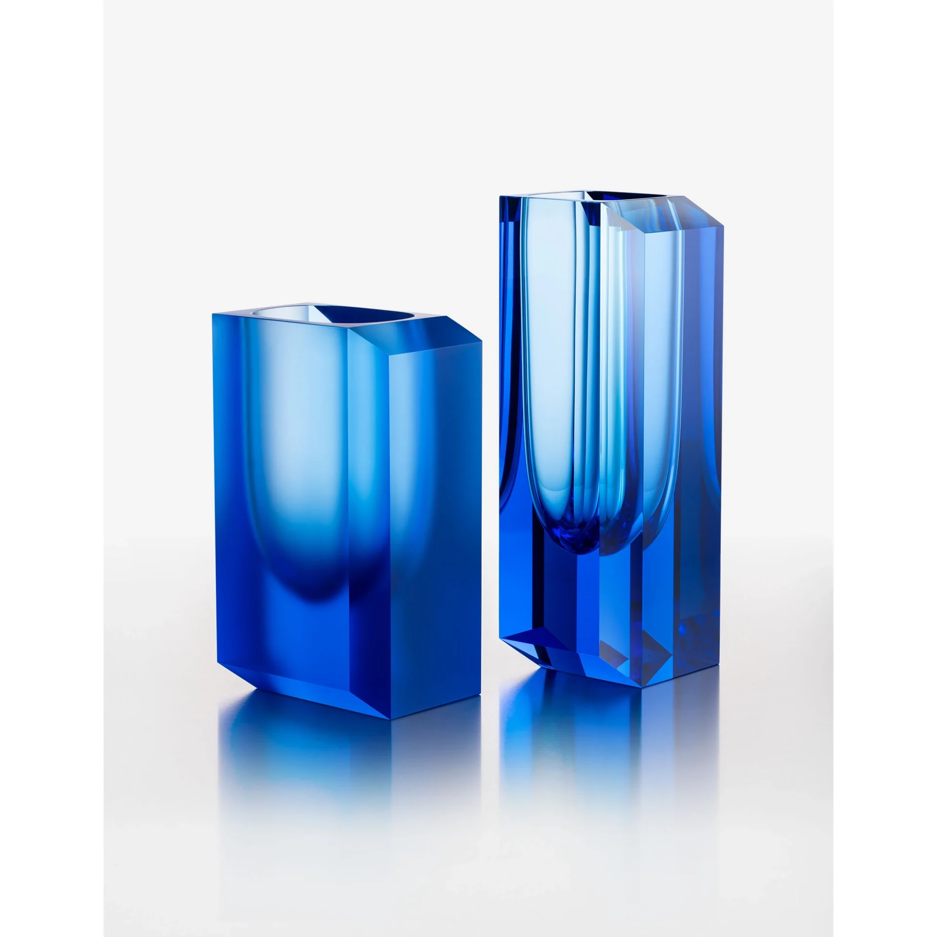 he innovative crystal object was inspired by the ocean. Lovers of freediving affirm that they find not only inspirational tension in the depths but also peace and harmony. For the Abyss vase, the strain between enormous pressure and meditative lightness embodies the contrast between the organically shaped core and the sharply cut exterior brutalist edges. The vase’s core is shaped by the glassmaker’s breath, making every piece unique.