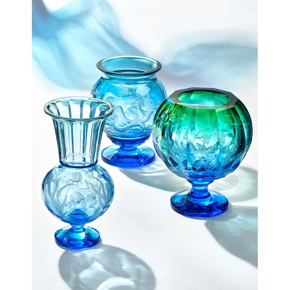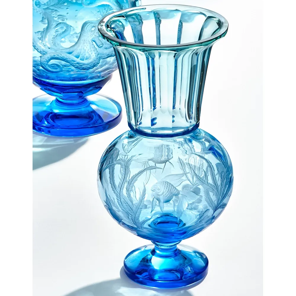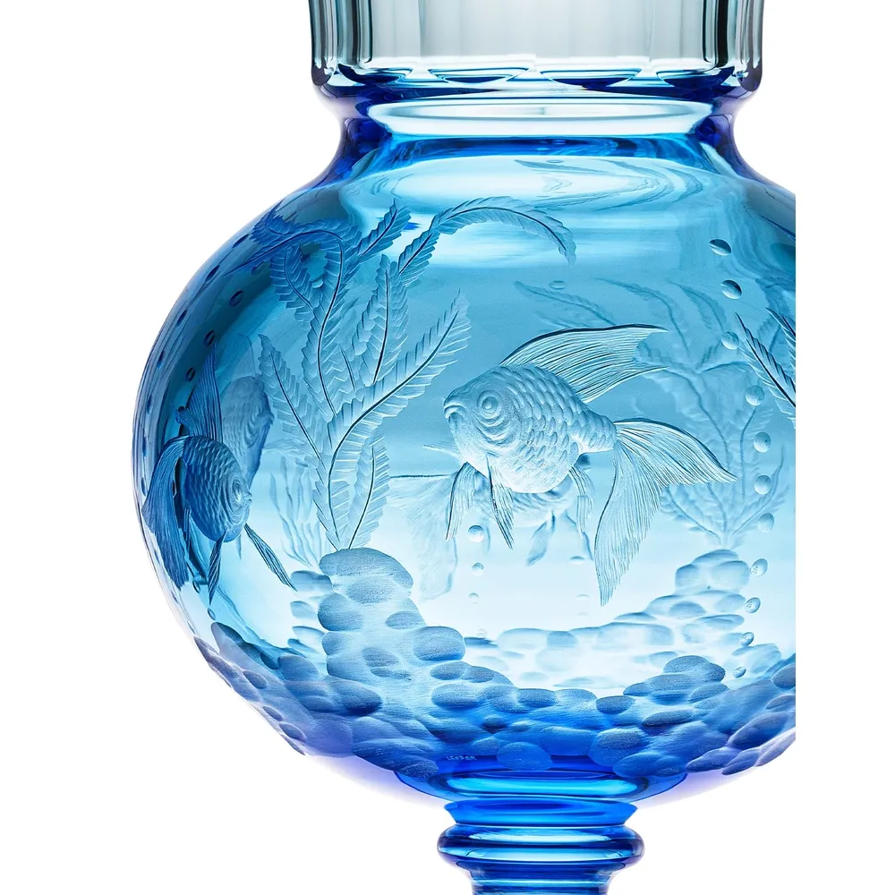 Gloriola is a ceremonial vase with a motif of aquarium fish and water plants. It stands firmly on a robust foot. The central cupola decorated with a precise engraving opens into a tall neck inspired by the design of Gloria collection of vases.